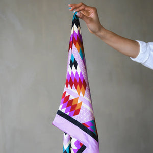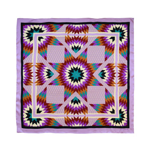 Contemporary fashion designer Bethany Yellowtail references Indigenous motifs that are often misappropriated to authentically and equitably represent her community in mainstream fashion. This vibrant silk scarf is adorned with the iconic star quilt pattern, known in Native American culture as a symbol of honor and love. Also available in Morning Star colorway.