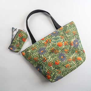 Although he never left France, Henri Rousseau imagined the flora and fauna of faraway places to create his lush jungle atmospheres. This tapestry was inspired by the dense orange grove and purple flowers in Woman Walking in an Exotic Forest. This oversized tote bag shows your love of fine art in a bright pattern. Carry this spacious tote for shopping or travel. Complete with a secure zipper closure and sturdy canvas webbing handles.