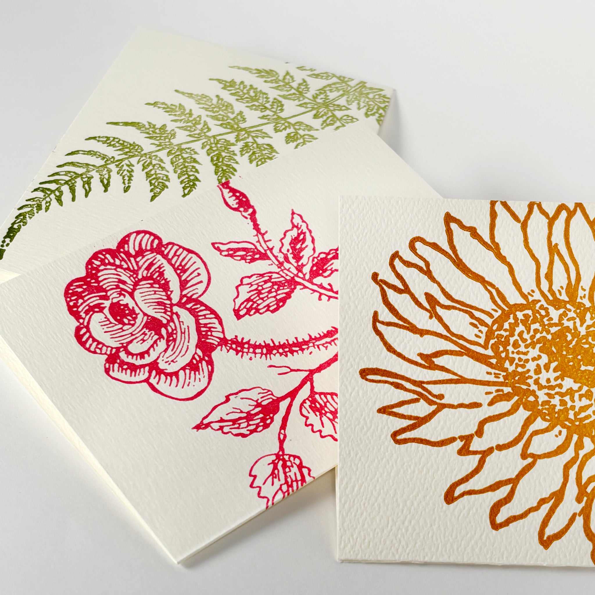 Send a small artwork along with your heartfelt message when you choose a letterpress printed card. These petite note cards feature vintage nature motifs in cheerful colors. Choose from three designs, sunflower, fern, and thorn rose.