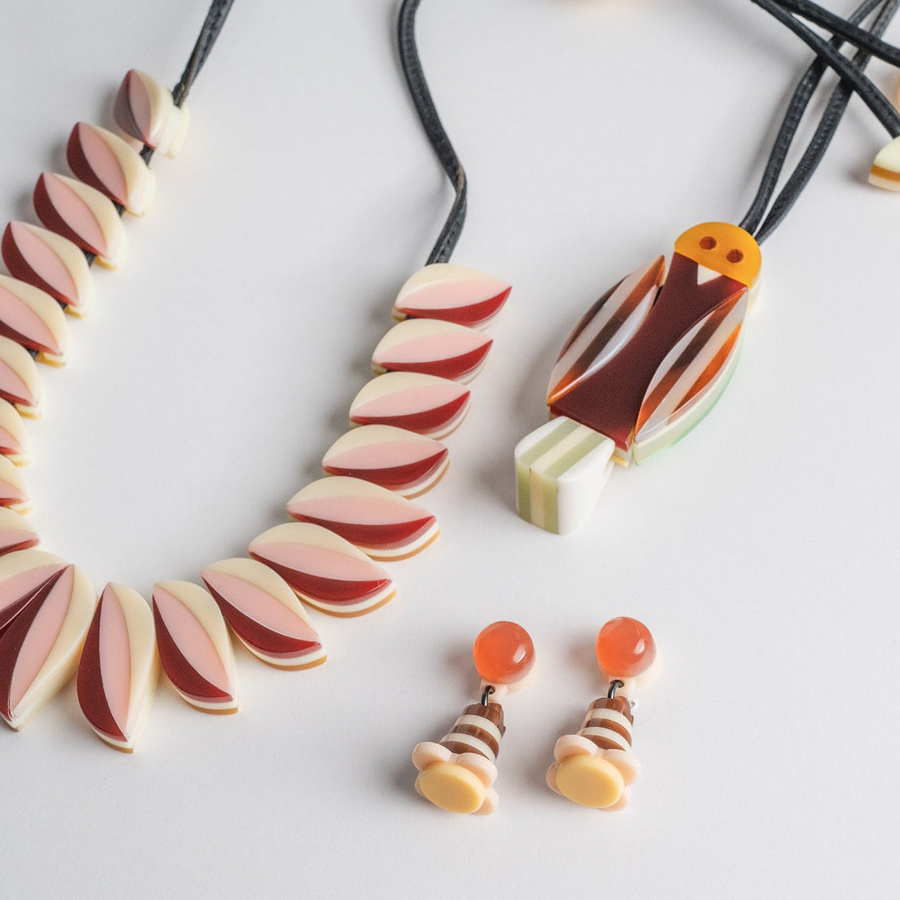 Finn Design has dreamt up a bespoke jewelry collection inspired by Henri Rousseau's paintings at the Barnes. Finn's retro aesthetic complements Rousseau's bold approach to painting, resulting in a jewelry collection that is playful and sophisticated. Each design is sustainably crafted from remnants of acrylic resin and acetate sourced from the optical industry.